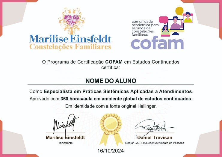 Possiblidade de prestar provas que atestam seu conhecimento teórico dos conteúdos fundamentais da constelação familiar Hellinger assim como da prática no atendimento a clientes.